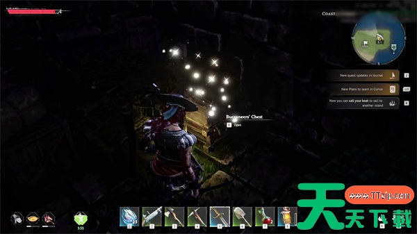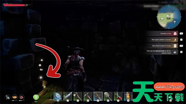 转身前往遗迹的另一侧,查看远墙旁被遗弃的物品。另一面墙上,你会发现第三个海盗箱,里面装着一把细剑和6个自制火药。
