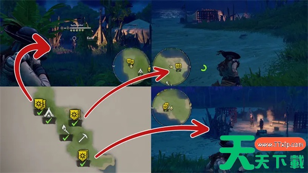 其余船员都在同一座岛上。前往地图上的金色标记,显示被困水手的三个营地。