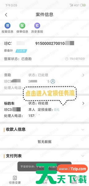 7、案件初始页面可查看案件的报案信息,保单信息,历史索赔等。此环节点击图片所示的标的车/三者车任务流,就可以开始定损咯!
