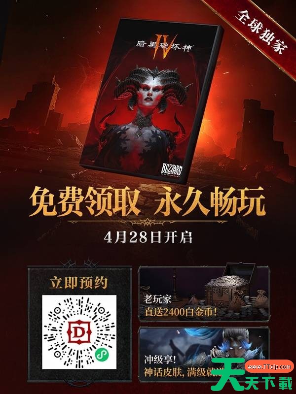 暗黑破坏神4国服将于近日上线憎恨之王扩展包,游戏在此期间将为大家带来丰厚的福利内容。玩家能够限时免费领取基础游戏本体并永久入库,老玩家将获得专属的返利与赛季限定外观奖励。今天天天下载Ttzip将为大家带来暗黑破坏神4国服本体免费领取指南,供有需要的玩家进行参考。
