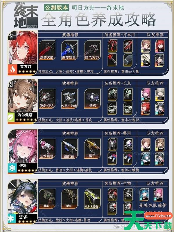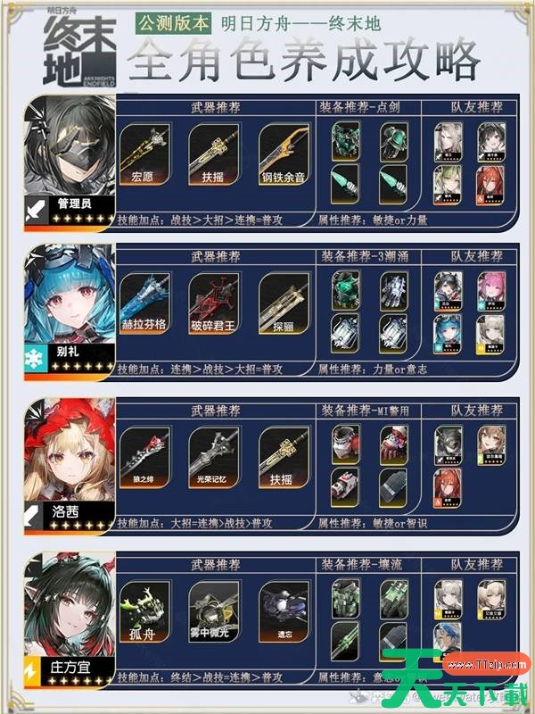 明日方舟终末地1.2版本增加了新的角色庄方宜,那么这个版本下各角色都要如何培养呢?下面请看为大家带来的明日方舟终末地1.2全角色养成攻略,一起来看看吧。