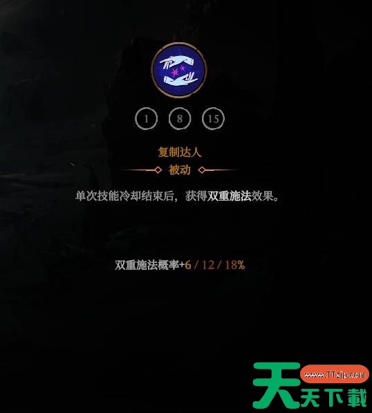 精灵法师的职业特性拥有双倍施法几率,所以我们可以围绕双倍施法来构筑,首先自己的职业技能【复制达人】就可以提升双倍施法几率,所以必点,还有一个双倍施法加血的可以提升生存。