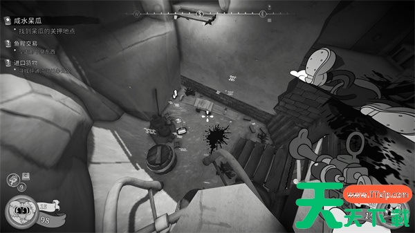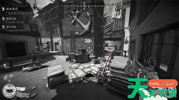 2、在 [砰通湾] 一路探索,进入屋内,拿到坑底的鲱鱼罐头。