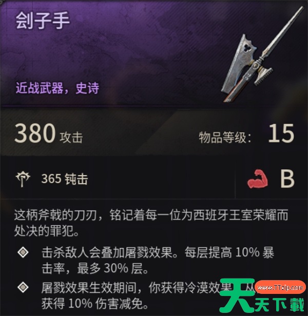 这套装备核心就是一把斧头,杀敌之后有30%暴击和10%减伤加成,清图还是不错的,打boss不太好用,主要是攻速太慢。