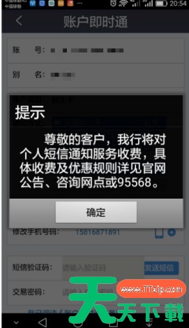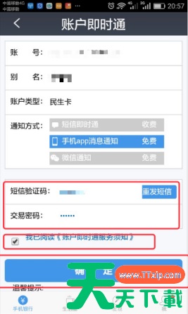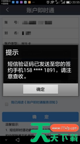 5、在接收短信的提示,“确定”一下,把收到的短息验证码填写,把交易密码也填写,并勾选“我已阅读...”,最后“确定”,具体如下图