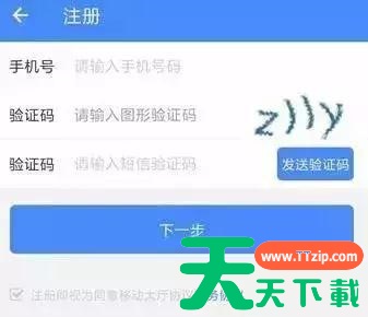 第二步:填写手机号码,在第二行的“验证码”栏输入图形验证码。点击“发送验证码”,收到验证短信后,在第三行的“验证码”栏输入6位短信验证码。全部输入完成后,点击“下一步”进入注册信息填写页面。