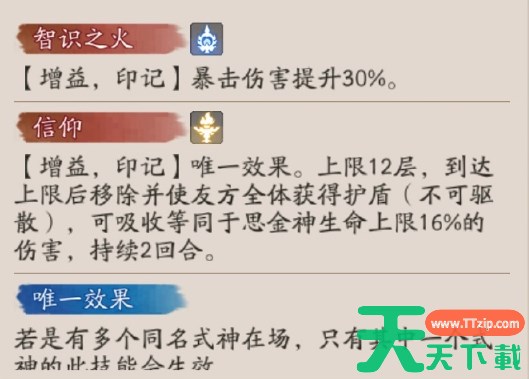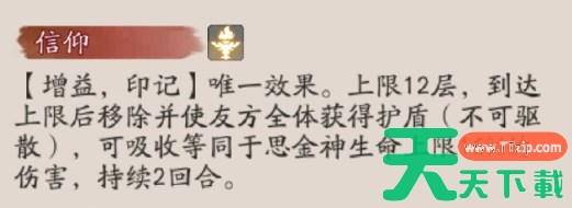 【增益,印记】唯一效果。上限12层,到达上限后移除并使友方全体获得护盾(不可驱散),可吸收等同于思金神生命上限16%的伤害,持续2回合。