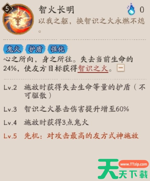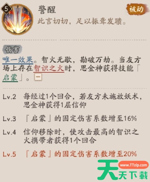 唯一效果。智火无歇,勘破万劫。当友方场上存在智识之火时,思金神获得技能「启蒙」。