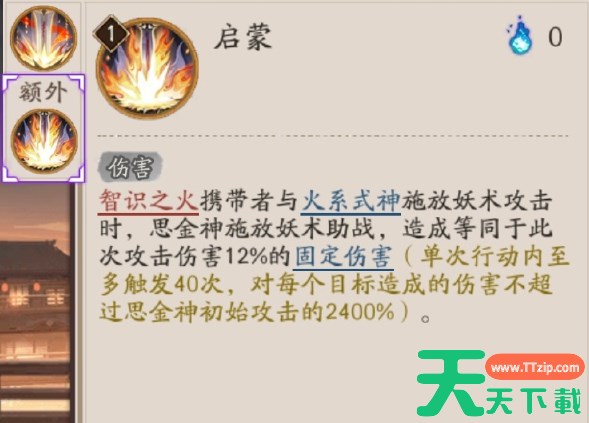 伤害智识之火携带者与火系式神施放妖术攻击时,思金神施放妖术助战,造成等同于此次攻击伤害12%的固定伤害(单次行动内至多触发40次,对每个目标造成的伤害不超过思金神初始攻击的2400%)。