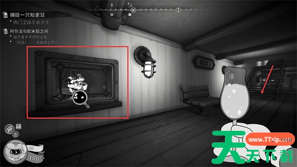 2、从存档点旁的门出去,右转下楼,再下楼,对尽头舷窗内拍照。