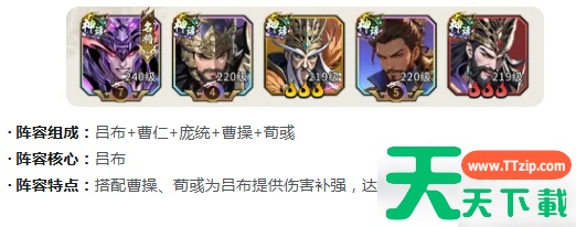 【爆发速攻体系】以吕布为核心输出,辅以曹仁、庞统、曹操、荀彧组成高机动斩杀阵。曹仁镇守前排承担主要伤害,曹操提供稳定增益,显著提升吕布单体与群体爆发阈值;庞统与荀彧协同补足控制链与战力增幅。该配置适用于野区清剿、PVP快节奏对抗,可实现多目标瞬时击破,战斗节奏紧凑高效。