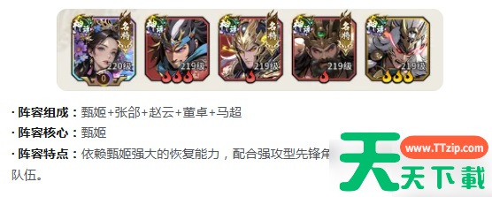 【均衡续航体系】甄姬作为治疗中枢,联动张郃、赵云、董卓、马超形成攻守兼备结构。甄姬提供高频群体回复与状态净化,确保全队血线长期处于安全区间;董卓稳固前排承伤,马超与赵云担任双突进输出位,兼顾爆发与压制能力。该体系泛用性强,对操作容错率高,适用于各类PVE挑战及常规竞技匹配。
