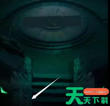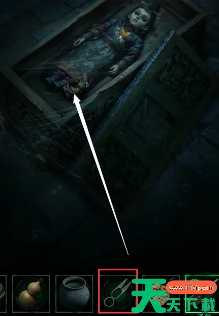 10、 根据之前获得的“禄寿福喜”顺序,解开左边柱子的密码,棺椁下降,使用烧红的剪刀剪开蛛丝,使用宝剑打开第一个棺。