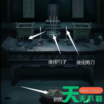 7、最左边的墓室,地上有火盆,点击火盆完成拼图,获得不同的颜色和数字信息,使用勺子在香炉上取一把香灰,把香灰倒进茶壶里,获得装满香灰水的茶壶,使用茶壶把香灰水倒进杯子里,再次获得四字密码“禄寿福喜”,使用剪刀在烛台上烤获得烧红的剪刀。