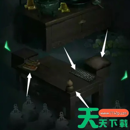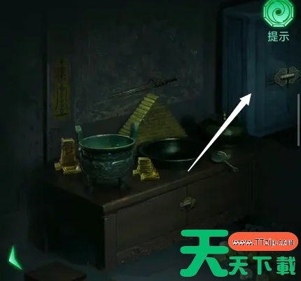 9、根据金饼信息,加上最左边墓室筷子上的红色“木”,写着蓝色“火”的青铜鼎,写着蓝色“香土”的陶罐,以及另一边墓室的写着绿色“水”字的玉簪,可解开主墓室左边的密码,停止射箭。