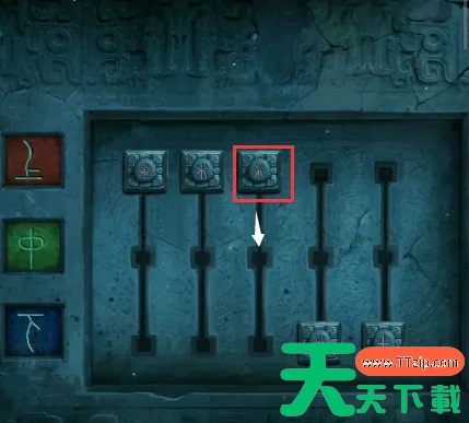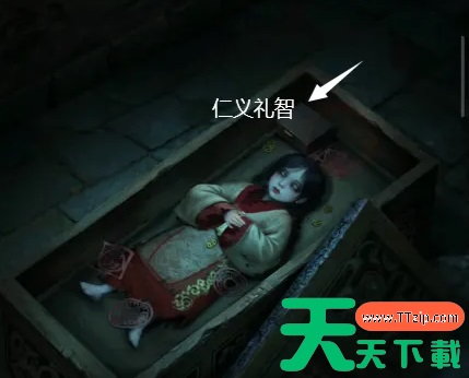 4、进入右边的墓室,第一个棺完成小游戏可打开,第三个棺根据之前算盘记载的数字把白点挪到45352的位置可打开,左上角有一个箱子,使用“仁义礼智”打开箱子,获得一把剪刀。