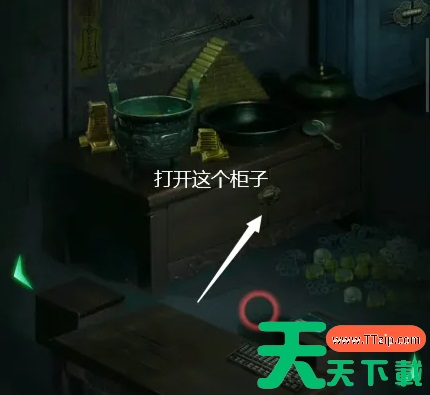 5、使用剪刀剪开第一个棺脚下的玩偶,获得玉佩和汤勺,使用玉佩打开第二个棺,把绣花鞋给女士穿,获得鸳鸯戒指,女尸头上有一个玉簪,上面有一个绿色的“水”字。