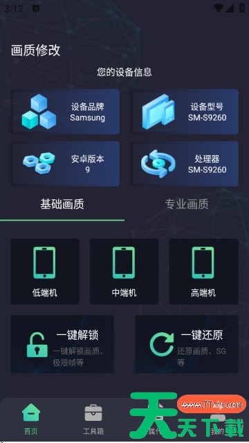 进入APP后,在“基础画质”板块可根据设备类型(低端机、中端机、高端机)选择对应的画质方案,也可使用“一键解锁”功能解锁画质、极限帧等,若需还原可点击“一键还原”。