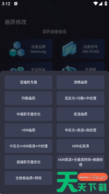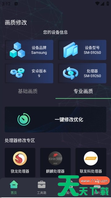 切换到“专业画质”板块,可点击“一键修改优化”快速优化画质,也可在“处理器修改专区”选择对应处理器(骁龙、麒麟、联发科)进行针对性优化。