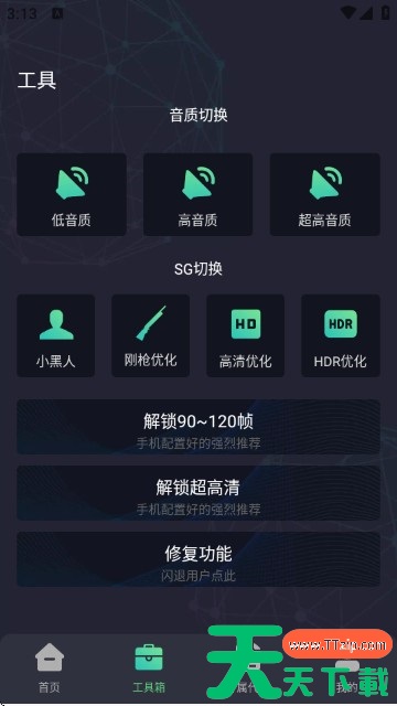 进入“工具箱”板块,可进行音质切换(低音质、高音质、超高音质)、SG切换(小黑、刚枪优化、高清优化等),还可解锁90~120帧、超高清画质,若遇到闪退可使用修复功能。