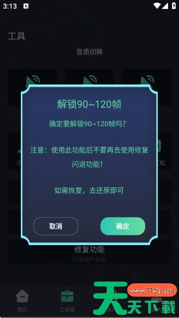 在工具箱中点击“解锁90~120帧”,确认提示后点击“确定”,即可解锁高帧率,提升游戏流畅度。