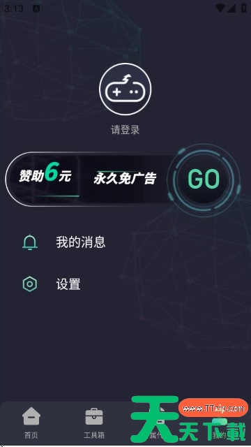 进入“我的”板块,可登录账号,也可选择赞助6元永久免广告,还可查看我的消息、进行设置操作。