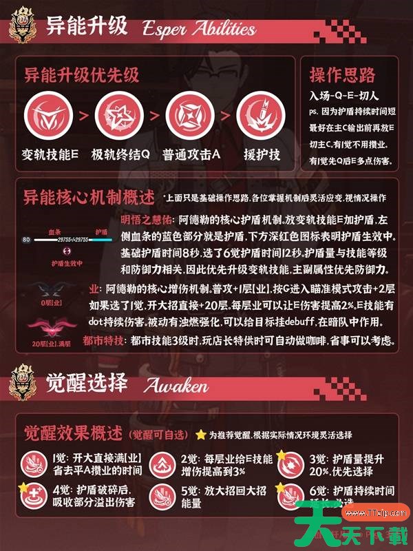 阿德勒机制比较简单,主要就是E技能套盾,但要注意护盾持续时间只有8秒,抽到第二只阿德勒时优先选择6觉,护盾时间提高到12秒。其次考虑3觉和4觉,提高护盾量。三个护盾觉醒选完后,选择1觉直接满层业提高E技能伤害。