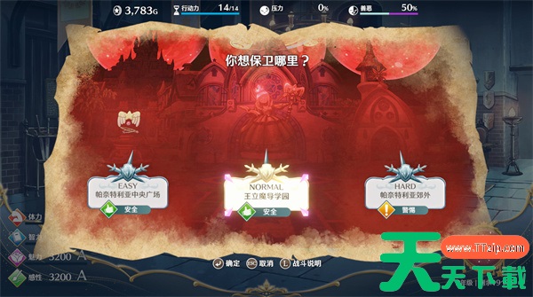 难度可以从EASY、NORMAL、HARD中选择。难度越高,获胜时得到的名声、道具、金钱、经验值就越多。如果要在保卫战中大显身手,就从平时开始通过讨伐魔物等行动,提升自己的战斗等级吧。