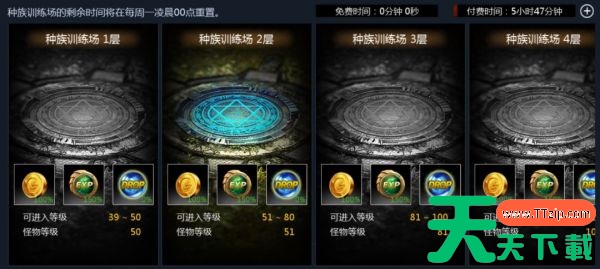 其中“种族训练场”是大家刷怪升级的重要地点,种族勋章商店里还可以兑换时间券!