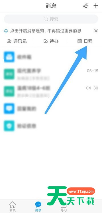 近日有一些小伙伴咨询天天下载学习通在哪查看日程?下面就为大家带来了学习通查看日程的方法,有需要的小伙伴可以来了解了解哦。 学习通在哪查看日程?学习通查看日程的方法 1、首先在手机桌面上找到学习通,点击进入软件(如图所示)。 2、然后在首页找到消息,点击进入(如图所示)。 3、最后就可以在消息列表中找到日程,就可以查看日程了(如图所示)。 以上就是给大家分享的学习通在哪查看日程的全部内容,更多精彩内容尽在天天下载! @天天下载 除特别注明外,本站所有文章均为 天天下载 原创,转载请注明出处来自 https://www.ttzip.com/25973.html