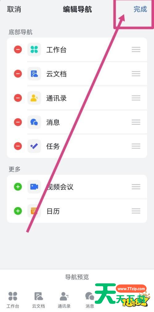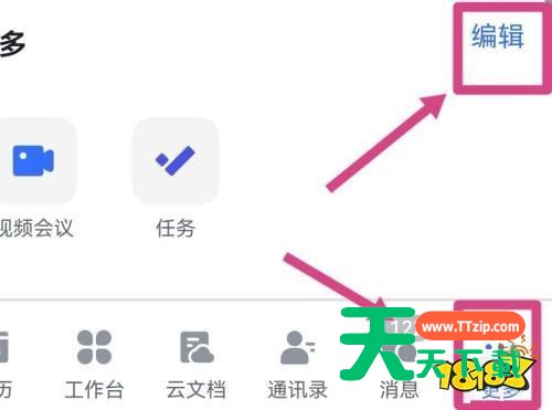 使用飞书的时候,很多小伙伴不知道如何设置底部导航,下面天天下载就给大家带来飞书设置底部导航教程,有需要的小伙伴不要错过哦。 飞书如何设置底部导航?飞书设置底部导航教程 1、首先打开并登录飞书账号,进入飞书页面后点击更多,在更多页面点击编辑。 2、然后点击编辑进入新页面中,在编辑导航页面点击导航功能左边的加减符号。 3、最后通过加减符号来修改底部的导航键的顺序,修改完成后点击确定,返回重新打开飞书即可看到新的顺序。 以上这篇文章就是飞书设置底部导航教程,更多教程尽在天天下载。 @天天下载 除特别注明外,本站所有文章均为 天天下载 原创,转载请注明出处来自 https://www.ttzip.com/26136.html