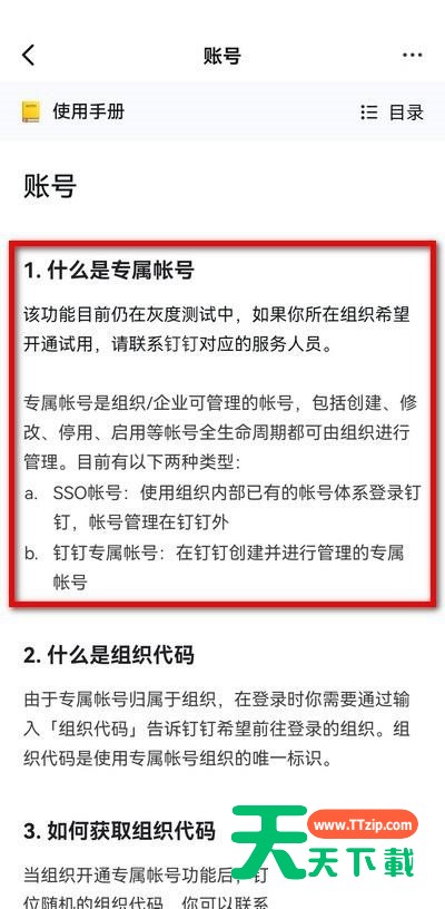 有的小伙伴会问天天下载钉钉专属帐号是什么意思,下面天天下载就为大家详细的介绍一下,想知道的话就来看看吧,相信一定会帮到你们的。 钉钉专属帐号是什么意思?钉钉专属帐号意思介绍 1、首先选择打开钉钉。 2、然后在登录界面点击专属帐号。 3、接着在打开的界面选择获取组织代码。 4、最后在这里查看什么是专属帐号。 谢谢大家阅读观看,希望本文能帮到大家! @天天下载 除特别注明外,本站所有文章均为 天天下载 原创,转载请注明出处来自 https://www.ttzip.com/26156.html