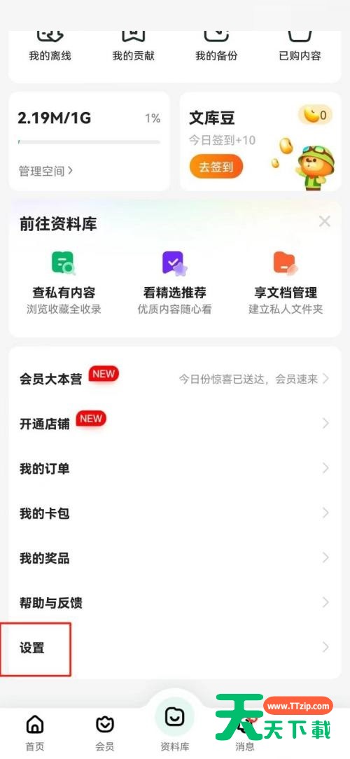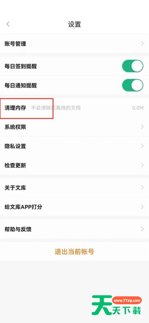 小伙伴们知道百度文库怎么清理内存吗?今天天天下载就来讲解百度文库清理内存的方法,感兴趣的快跟天天下载一起来看看吧,希望能够帮助到大家。 百度文库怎么清理内存?百度文库清理内存的方法 第一步:进入【百度文库】APP首页,点击右下角【我的】,详见下图所示; 第二步:点击【设置】,详见下图所示; 第三步:点击【清理内存】即可,详见下图所示。 以上就是给大家分享的百度文库怎么清理内存的全部内容,更多精彩内容尽在天天下载! @天天下载 除特别注明外,本站所有文章均为 天天下载 原创,转载请注明出处来自 https://www.ttzip.com/26232.html