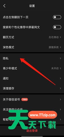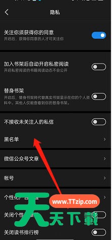 很多小伙伴在使用微信读书的时候,想知道怎么查找黑名单,下面天天下载就为大家分享微信读书查找黑名单教程,感兴趣的小伙伴不要错过哦! 微信读书怎么查找黑名单?微信读书查找黑名单教程 1、首先打开APP后,选择上方的设置。 2、然后点击隐私。 3、最后选择黑名单进入即可。 希望此教程能帮到大家!更多教程请关注天天下载! @天天下载 除特别注明外,本站所有文章均为 天天下载 原创,转载请注明出处来自 https://www.ttzip.com/26323.html