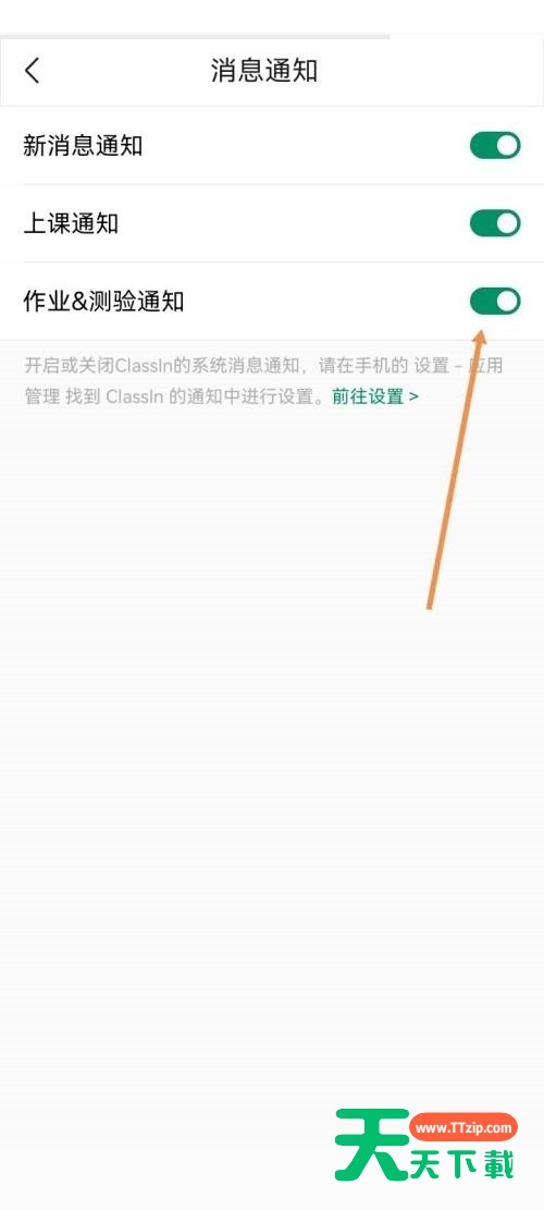 使用ClassIn的时候,很多小伙伴不知道怎么开启作业测验通知,下面天天下载就给大家带来ClassIn开启作业测验通知教程,有需要的小伙伴不要错过哦。 ClassIn怎么开启作业测验通知?ClassIn开启作业测验通知教程 1、首先打开ClassIn软件,点击左上角的头像。 2、然后点击这个界面中的设置。 3、接着点击新消息通知。 4、最后开启作业测验通知的开关按钮即可。 以上这篇文章就是ClassIn开启作业测验通知教程,更多教程尽在天天下载。 @天天下载 除特别注明外,本站所有文章均为 天天下载 原创,转载请注明出处来自 https://www.ttzip.com/26404.html