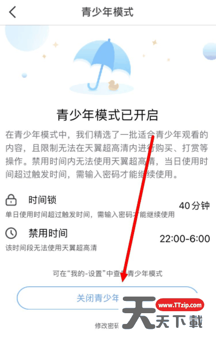 今天天天下载为大家带来了天翼超高清关闭青少年模式教程,想知道怎么做的小伙伴来看看接下来的这篇文章吧,相信一定会帮到你们的。 天翼超高清怎么关闭青少年模式?天翼超高清关闭青少年模式教程 第一步,打开天翼超高清App,在首页界面,点击右上角的【退出】。 第二步,然后,点击下方的【关闭青少年模式】选项。 第三步,最后,输入密码。 第四步,这样青少年模式就已关闭了。 以上这篇文章就是天翼超高清关闭青少年模式教程,更多教程尽在天天下载。 @天天下载 除特别注明外,本站所有文章均为 天天下载 原创,转载请注明出处来自 https://www.ttzip.com/26410.html
