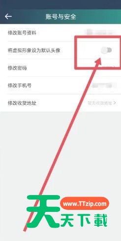 3、最后打开账号与安全之后,点击开启“将虚拟形象设为默认头像”功能就可以了。