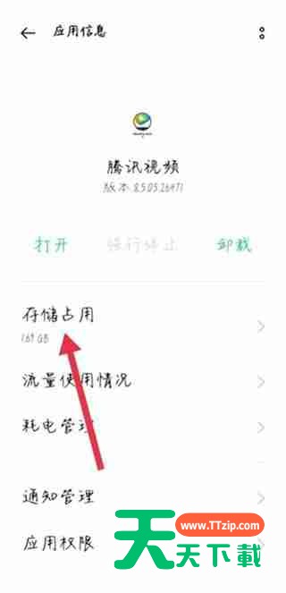 - 进入腾讯视频应用信息页面,找到“存储”或“存储空间”选项(具体名称可能因手机系统而异)。