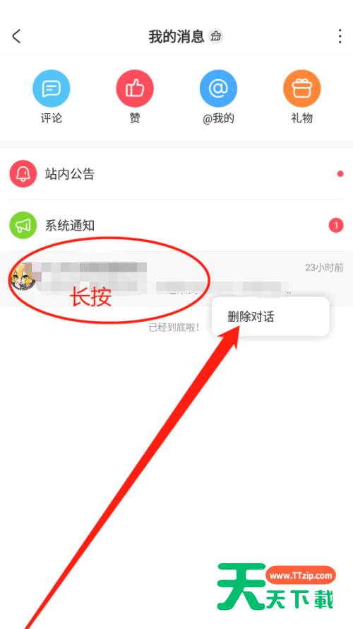 使用AcFun的时候,很多小伙伴不知道AcFun怎么删除对话,下面天天下载就给大家带来AcFun删除对话方法,有需要的小伙伴不要错过哦。 AcFun怎么删除对话?AcFun删除对话方法 1、首先,点击消息图标,打开我的消息功能; 2、然后打开之后,长按对话,点击删除对话按钮,就可以删除选中的对话了。 以上这篇文章就是AcFun删除对话方法,更多教程尽在天天下载。 @天天下载 除特别注明外,本站所有文章均为 天天下载 原创,转载请注明出处来自 https://www.ttzip.com/26676.html