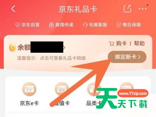 今天天天下载为大家带来的是京东绑定京东卡教程,想知道怎么做的小伙伴来看看接下来的这篇文章吧,相信一定会帮到你们的。 京东怎么绑定京东卡?京东绑定京东卡教程 1、首先打开京东,点击右下角【我的】。 2、然后来我的页面以后,点击【礼品卡】。 3、接着在礼品卡页面,点击【绑定新卡】。 4、最后页面跳转,按要求输入卡密去绑定即可。 以上这篇文章就是京东绑定京东卡教程,更多教程尽在天天下载。 @天天下载 除特别注明外,本站所有文章均为 天天下载 原创,转载请注明出处来自 https://www.ttzip.com/26736.html