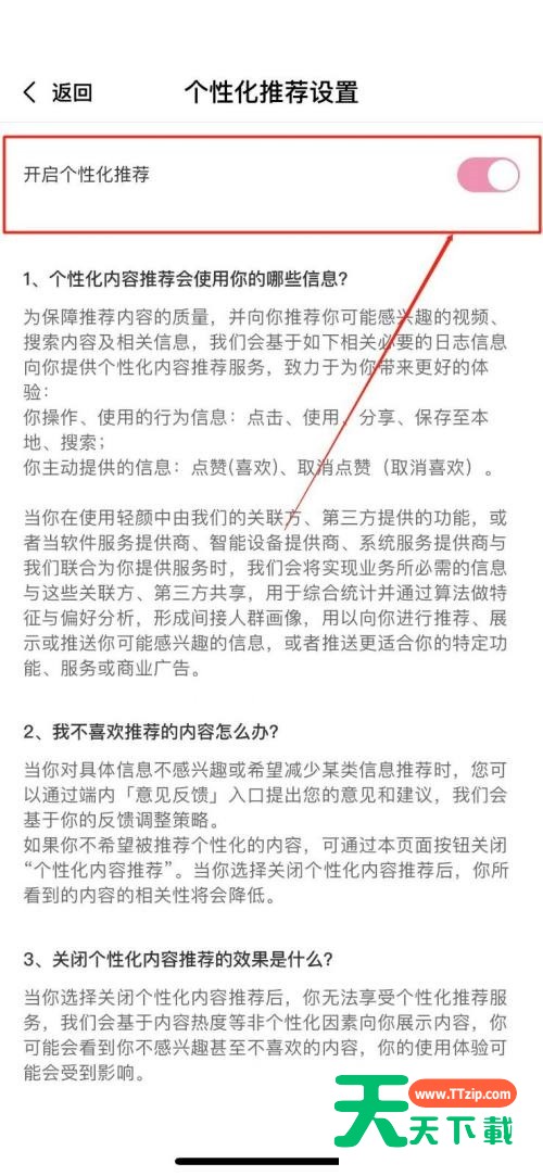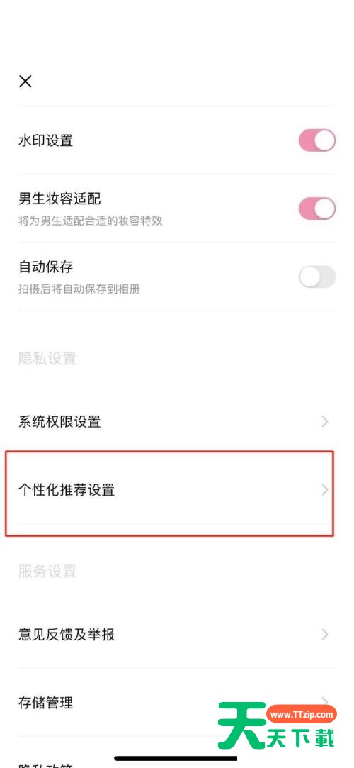 很多小伙伴在使用轻颜相机的时候,想知道怎么关闭个性化推荐,下面天天下载就为大家分享关闭个性化推荐方法,感兴趣的小伙伴不要错过哦! 轻颜相机怎么关闭个性化推荐?轻颜相机关闭个性化推荐方法 1、首先打开轻颜相机,点击左上角【设置】。 2、然后进入设置页面,点击列表中的【个性化推荐设置】。 3、最后点击【个性化推荐】后方模块进行关闭。即可操作成功。 希望此教程能帮到大家!更多教程请关注天天下载! @天天下载 除特别注明外,本站所有文章均为 天天下载 原创,转载请注明出处来自 https://www.ttzip.com/26942.html