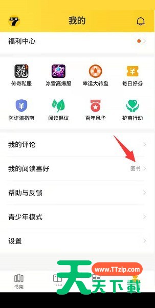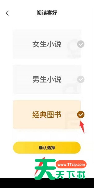 有的小伙伴会问天天下载七猫免费小说怎么设置阅读喜好,下面天天下载就为大家详细的介绍一下,想知道的话就来看看吧,相信一定会帮到你们的。 七猫免费小说怎么设置阅读喜好?七猫免费小说设置阅读喜好教程 1、首先打开七猫免费小说我的页面,点开下方的我的阅读喜好。 2、然后点开后在页面里找到阅读喜好。 3、接着勾选喜好类型后,点击下方的确认选择。 4、最后这样我的阅读喜好就设置成功了。 谢谢大家阅读观看,希望本文能帮到大家! @天天下载 除特别注明外,本站所有文章均为 天天下载 原创,转载请注明出处来自 https://www.ttzip.com/26989.html