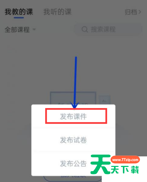 今天天天下载为大家带来了长江雨课堂发布课件教程,想知道怎么做的小伙伴来看看接下来的这篇文章吧,相信一定会帮到你们的。 长江雨课堂怎么发布课件?长江雨课堂发布课件教程 1、首先,打开长江雨课堂软件,在主界面右上角点击加号图标。 2、然后,点击进入发布界面,如图。 3、最后,点击发布课件按钮,进入即可成功发布课件。 以上这篇文章就是长江雨课堂发布课件教程,更多教程尽在天天下载。 @天天下载 除特别注明外,本站所有文章均为 天天下载 原创,转载请注明出处来自 https://www.ttzip.com/27055.html