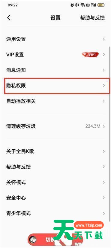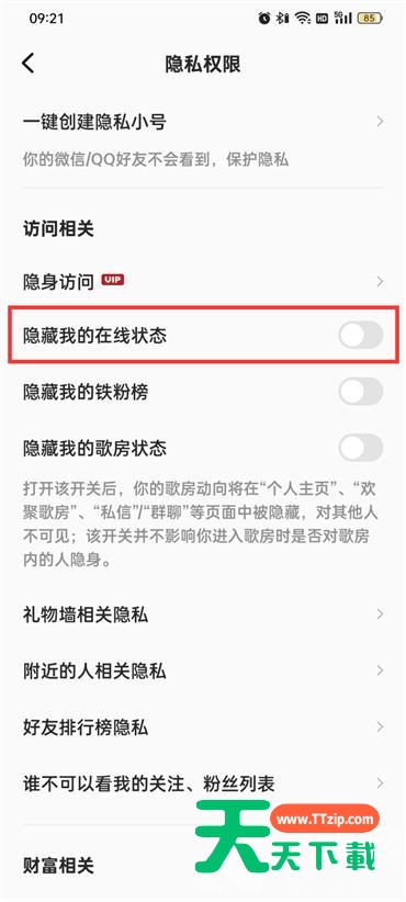 全民K歌的在线状态是可以设置进行隐藏的,那么全民K歌怎么隐藏在线状态呢?下面天天下载就为大家带来了方法,希望对你有所帮助。 全民K歌怎么隐藏在线状态?全民K歌隐藏在线状态方法 1.首先打开全民K歌软件,进入到全民K歌的页面中点击右下角的【我的】来到个人主页; 2.然后在个人主页的页面中点击左上角的【设置】图标; 3.在设置页面中点击【隐私权限】; 4.最后在隐私权限的页面中点击开启【隐藏我的在线状态】把后后面的按钮打开即可; 以上这篇文章就是全民K歌怎么隐藏在线状态的全部内容,更多手机教程请关注天天下载! @天天下载 除特别注明外,本站所有文章均为 天天下载 原创,转载请注明出处来自 https://www.ttzip.com/27070.html