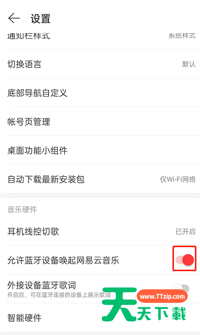 网易云音乐怎么关闭蓝牙设备唤醒?不少用户对此还不知道怎么关闭,下面天天下载为您带来一个可以关闭蓝牙唤起网易云音乐的方法,赶紧来学习一下! 网易云音乐怎么关闭蓝牙设备唤醒?网易云音乐关闭蓝牙设备唤醒教程 1、首先打开网易云音乐,点击左上角三横线。 2、然后点击设置。 3、最后将允许蓝牙设备唤起网易云音乐右侧开关关闭即可。 谢谢大家的观看,更多手机教程请关注天天下载! @天天下载 除特别注明外,本站所有文章均为 天天下载 原创,转载请注明出处来自 https://www.ttzip.com/27099.html