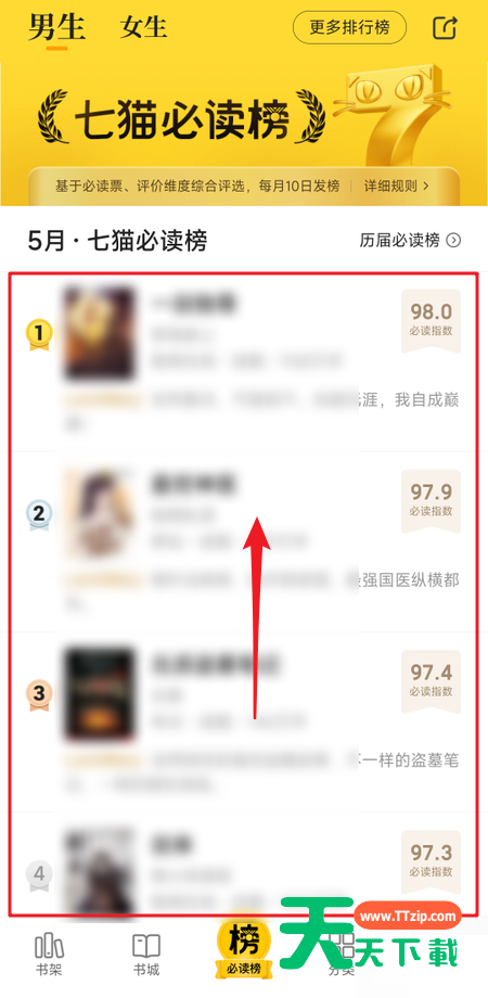 很多小伙伴在使用七猫免费小说的时候,想知道怎么查看必读榜,下面天天下载就为大家分享查看教程,感兴趣的小伙伴不要错过哦! 七猫免费小说必读榜怎么查看?七猫免费小说必读榜查看教程 1、首先通过点击【七猫免费小说】图标来启动七猫免费小说APP。 2、然后打开七猫免费小说后,点击【必读榜】按钮。 3、最后在必读榜界面,即可查看必读榜书籍。 希望此教程能帮到大家!更多教程请关注天天下载! @天天下载 除特别注明外,本站所有文章均为 天天下载 原创,转载请注明出处来自 https://www.ttzip.com/27123.html