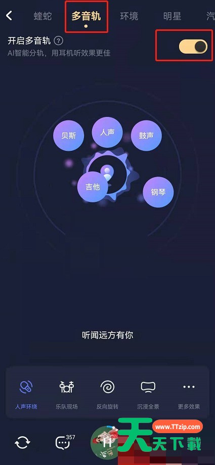 有的小伙伴在使用酷狗音乐的过程中,设置开启了多音轨功能,想要关闭却不知道怎么弄,下面天天下载就为大家带来了关闭方法,希望对你有所帮助哦! 酷狗音乐多音轨怎么关闭?酷狗音乐多音轨关闭方法 1、首先在酷狗音乐中打开歌曲播放页,点击音效按钮。 2、然后进入后点击多音轨板块,点击右侧按钮即可关闭。 谢谢大家阅读观看,希望本文能帮到大家! @天天下载 除特别注明外,本站所有文章均为 天天下载 原创,转载请注明出处来自 https://www.ttzip.com/27325.html