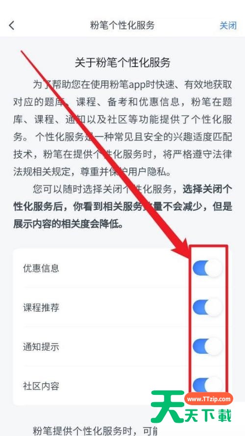 使用粉笔的时候,很多小伙伴不知道怎么关闭个性化服务项,下面天天下载就给大家带来粉笔关闭个性化服务项方法,有需要的小伙伴不要错过哦。 粉笔怎么关闭个性化服务项?粉笔关闭个性化服务项方法 1、首先点击设置; 2、然后点击个人化服务; 3、最后在粉笔个性化服务内点击按钮进行关闭即可。 以上这篇文章就是粉笔关闭个性化服务项方法,更多教程尽在天天下载。 @天天下载 除特别注明外,本站所有文章均为 天天下载 原创,转载请注明出处来自 https://www.ttzip.com/27388.html
