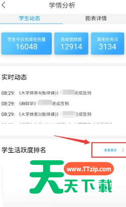 使用学习通的时候,很多小伙伴不知道怎么查看活跃度,下面天天下载就给大家带来学习通查看活跃度方法,有需要的小伙伴不要错过哦。 学习通怎么查看活跃度?学习通查看活跃度方法 第一步:首先,打开下载好的学习通(如图所示)。 第二步:来到主界面,点击学情分析(如图所示)。 第三步:再点击查看更多(如图所示)。 第四步:查看自己就在搜索栏输入自己的姓名或学号,搜索即可(如图所示)。 第五步:再点击学生画像,还可以查看签到等更多信息(如图所示)。 谢谢大家阅读这篇学习通查看活跃度方法,更多手机教程请关注天天下载! @天天下载 除特别注明外,本站所有文章均为 天天下载 原创,转载请注明出处来自 https://www.ttzip.com/27809.html