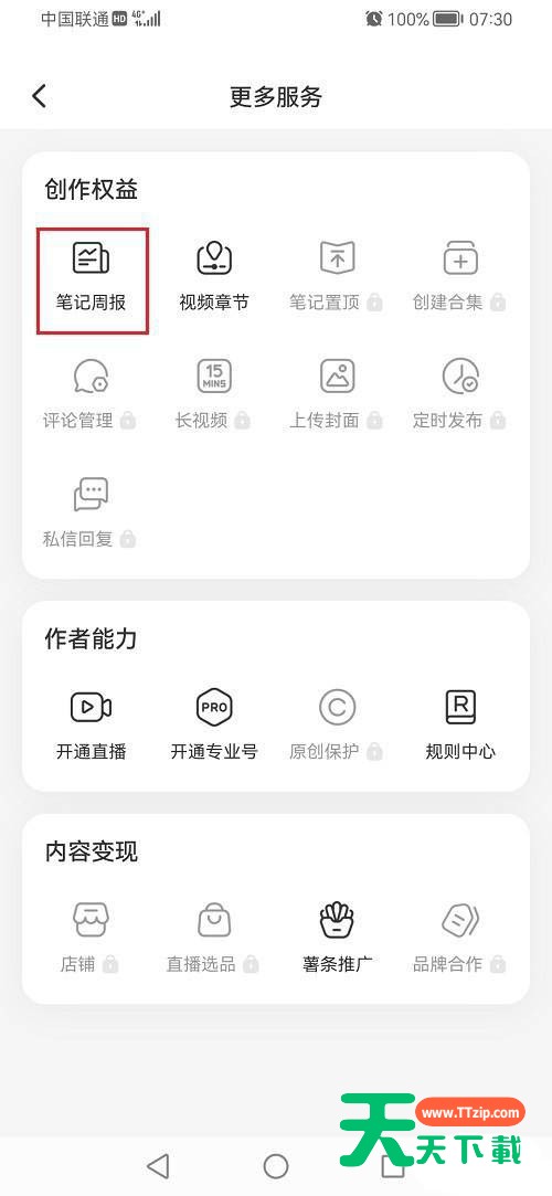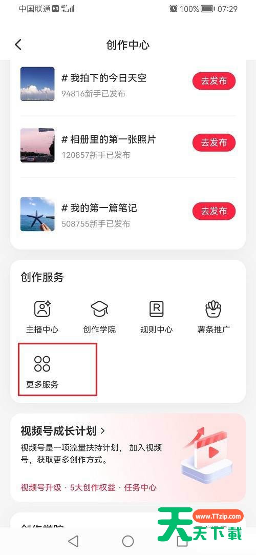很多小伙伴在使用小红书的时候,想知道笔记周报怎么查看,下面天天下载就为大家分享小红书笔记周报查看教程,感兴趣的小伙伴不要错过哦! 小红书笔记周报怎么查看?小红书笔记周报查看教程 1、第一步打开手机,点击小红书 2、第二步进去小红书我的界面之后,点击列表图标 3、第三步进去小红书侧边栏之后,点击创作中心 4、第四步进去创作中心之后,点击更多服务 5、第五步进去之后,点击笔记周报,可以查看小红书笔记周报,根据需要使用 谢谢大家阅读观看,希望本文能帮到大家! @天天下载 除特别注明外,本站所有文章均为 天天下载 原创,转载请注明出处来自 https://www.ttzip.com/28582.html